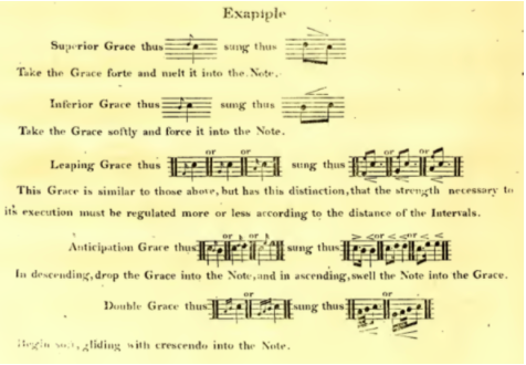 Corri uses multiple colourful phrases to describe the execution of different ornaments: to “take softly;” to “take strong[ly];” to “sink into the note;”150 to “melt into the note;” to “force into the note;” and to “drop…into the note.”151 Of all these descriptors, the words “melt” and “sink” seem to be most evocative of the usual kind of portamento we are used to hearing from singers today. However, Corri uses neither of these terms when describing his “leaped graces,” instead preferring to emphasise the fact that they should “leap into the note rapidly.” This, again, seems to point to the idea that Corri’s leaped graces are an exceptional case.