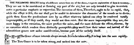 Corri provides multiple tables of ornaments throughout both The Singer’s Preceptor and his numerous volumes of collections. Many of these are repetitive, with only slight variations arising between those printed in different publications. Perhaps the most intriguing section, which appears in several of these tables, is the paragraph discussing “leaping graces.” When approaching these settings from the point of view of Scottish traditional music, these “leaping graces” might immediately strike one as suggesting a kind of articulatory ornamentation. In the context of this study, such an interpretation seems only natural – after all, Corri played the pipes, and spent most of his working life in Scotland, during a period of intense national interest in the pipes. However, in much of the secondary literature, these graces are usually interpreted as indicating a kind of portamento.145 Of course, these two categorisations are not mutually exclusive: a portamento which is executed “rapidly” and “[almost] imperceptibly”146 would, by its very nature, have something of an articulatory effect. Likewise, it would be almost impossible to sing such a rapid leaping ornament (while maintaining a full sound) without some degree of portamento occurring.