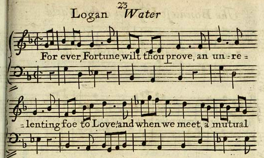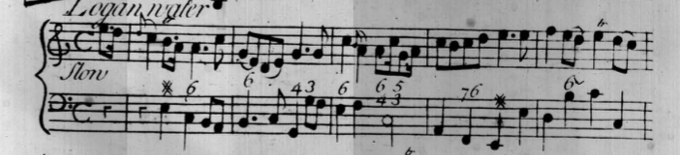 Returning to Talbot’s claim that Barsanti’s ornamentation approximates “the inflections of the Scottish manner of cantillation,”48 it seems entirely possible that Barsanti’s source for these tunes was vocal. At least two thirds of the tunes can also be found in Thomson’s Orpheus Caledonius,49 which is clearly intended for singing. Likewise, texts have been found for all of the remaining tunes, with the exception of The Sutours of Selkirk.50 However, although concordances may exist between these tunes and texts, Barsanti’s rhythm and articulation markings sometimes seem to contradict these. The rhythmic variation in Logan Water, for instance, diverges significantly form Thomson’s setting, to the extent that any attempt to set the same text to Barsanti’s notation of the tune would result in unusual scansion.
