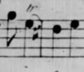 The inconsistent notation of these ornaments could be explained by Talbot’s claim that Barsanti was notating musical phenomena not easily expressed by conventional notation.46 This may also be why John Glen had the impression that Barsanti had “taken down a traditional set that he heard sung or played,”47 – the inconsistent notation suggests that Barsanti had heard these tunes performed in a way that he was unaccustomed to notating. Indeed, a cut, or even a roll, as performed by Traditional Scottish musicians today, might provide a solution to the inconsistent ornamentation in Dumbarton Drums. If Barsanti had heard the two-crotchet figure separated by something resembling a cut, as used by Traditional musicians today, then this may have been approximated in the way described above. In this case, the upper note is played so quickly that it would be very difficult to decide whether to write it as a grace note tied to the first or second crotchet, or indeed as a trill, if the cut is part of a larger roll or cutting. The speed at which an ornament like this is executed would negate the harmonic question raised earlier, as the resulting effect would be articulatory, rather than harmonic in nature.