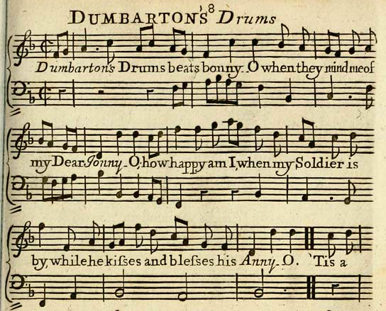 The variety and inconsistency of notational symbols used raises many questions about their performance. In several cases, different symbols are used in places that appear to be analogous, where one would expect to find the same symbol used. In Dumbarton’s Drums,44 for instance, one would expect to find similar notation used in bars 2, 4, 8, 10, 12, and 16 – in the treble part, the same crotchet rhythm is played, with an ascending leap between beats 1 and 2, followed by an ornament between repeated notes on beats 2 and 3. In vocal sources of this tune, these bars are even more congruous, as each line of text ends with the same nonsense syllable “-O!”45 (see figure 2). However, Barsanti notates this differently in each bar, successively using a grace note slurred to the third crotchet, a trill, and later a grace note slurred from the second crotchet. While it’s possible that this variety was intended by Barsanti, the resulting effect of these ornaments (if played absolutely literally) is not totally convincing. Why, for instance, would the longest and most stressed of these graces appear in bar 3 – that is, on a consonant note, resolving to a ninth? Alternatively, if this note is to be played before the beat, (which would make more sense harmonically) why is it not written in the same manner as the grace note in bar 8?
