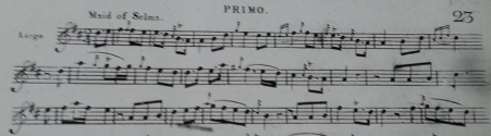 The Maid of Selma also includes several graces quitted by downward leap, which would likewise suggest a connection with bagpipe practice, or at the very least, a cut. These cuttings, though clearly derived from some kind of articulatory ornamentation, are not quite as extreme in their notation as some contemporary collections of bagpipe music adapted for the flute. One such collection, by Donald McDonald, regularly features cuttings spanning a fourth or fifth or even more. The preface to this publication suggests that the treble line could be played by a flute player, so the comparison is particularly relevant.118