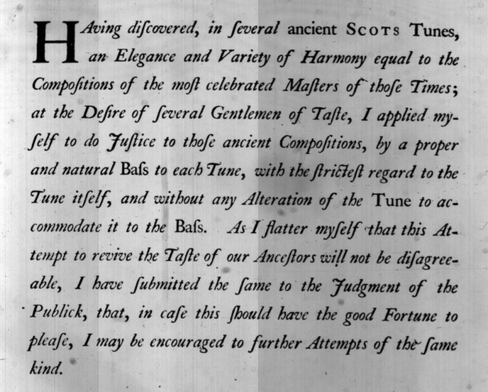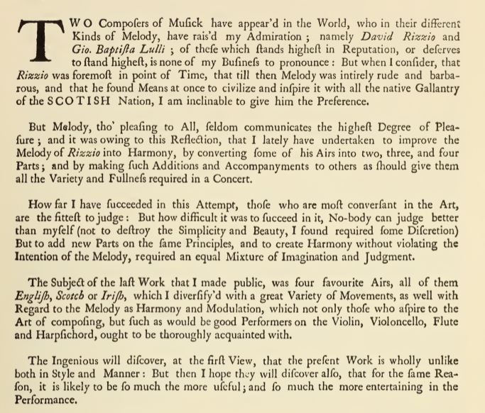 Fig. 3.1.2: "Preface," to Francesco Barsanti, A Collection of Old Scots Tunes, (Edinburgh: Alexander Baillie, 1742).