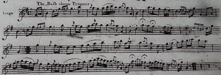 Beginning with Urbani’s treatment of Scots Tunes for the flute, one notices (for the first time in any Italian source) ornamentation practices which distinctly resemble those of bagpipe music. In multiple places throughout his A Favorite Selection of Scots Tunes properly arranged as Duettos for Two German Flutes or Two Violins, Urbani marks grace notes that suggest a kind of articulatory ornamentation. In The Bush Aboon Tranquair,116 for instance, we find repeated use of what looks like a turn between notes of the same pitch. The consistency with which this ornament appears between notes of the same pitch suggests a need to separate the second from the first by use of the fingers, rather than the tongue. If executed quickly, the turn notated by Urbani could easily be mistaken for a roll, which would be entirely consistent with both highland bagpipe practice and Scottish Traditional performance practices. Further, the use of such an ornament on a note value as short as a dotted semiquaver implies that the entire group of notes was, indeed, executed rather quickly. Ford concludes the presence of these ornaments implies that Urbani notated these tunes from listening to a piper.117