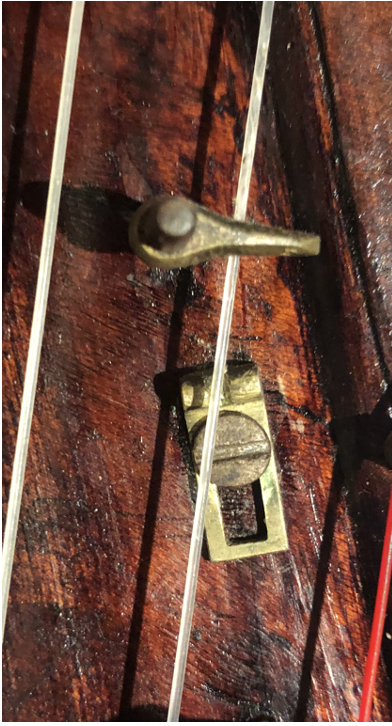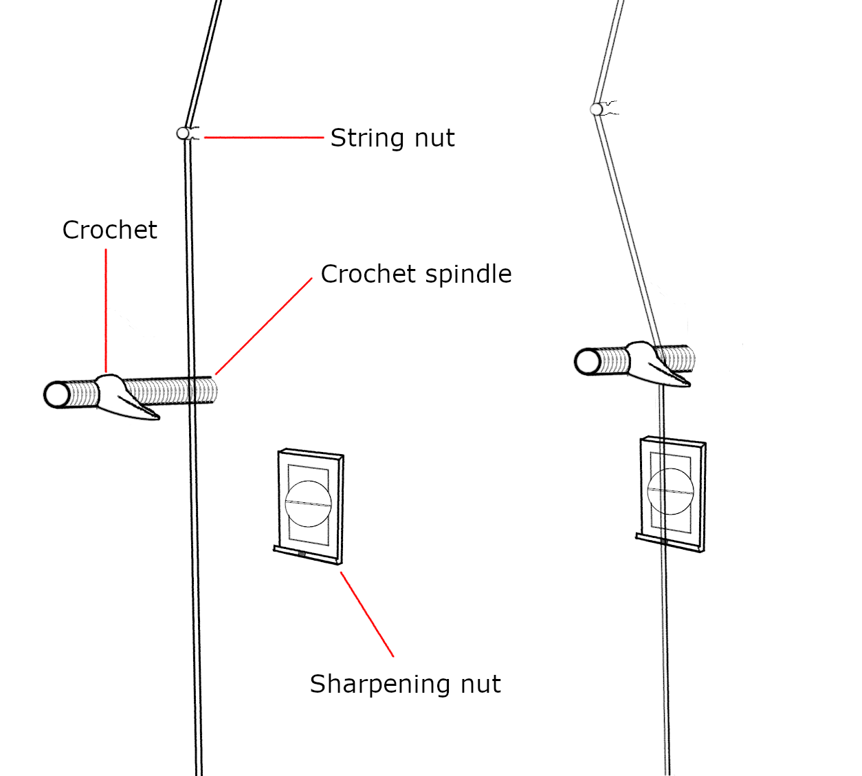 The above figure shows a crochet in both the neutral (left) and engaged (right) positions. Rather than the L-shaped crutches of Hochbrucker, the crochet harp featured threaded “crochet spindles,” exiting the neck horizontally through drilled holes adjacent to each string. Upon each of these spindles was a threaded brass crochet (“hook” in English). Upon depression of the pedal, the crochet would retract into the neck, pulling the string towards the neck and against the "sharpening nut" and raising the pitch by a semitone.