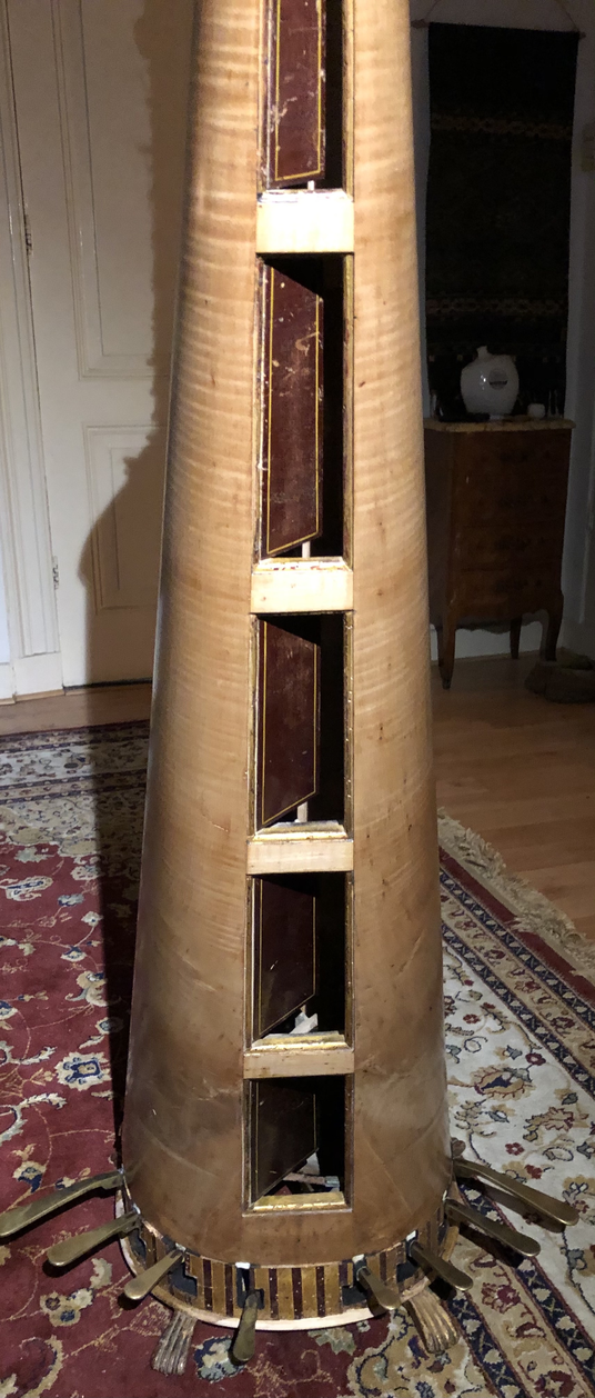 Unlike modern harps, the early crochet harp’s sound holes were cut into the soundboard, rather than in the back of the body, which was solid and staved. In 1786, harp player Jean-Baptiste Krumpholtz presented his invention of a system of portes de renforcement (“swell doors” in English). These were hinged doors (see figure 10) cut into the body of the instrument which could be opened and closed by an 8th foot pedal, slightly altering the sound. Several prominent harpists and composers advocated strongly for the effect produced by these doors, and their importance is reflected in their retention well into the mid and even the late 19th century in the case of some makers, however, they fell out of use in the early 20th century, for a number of reasons.