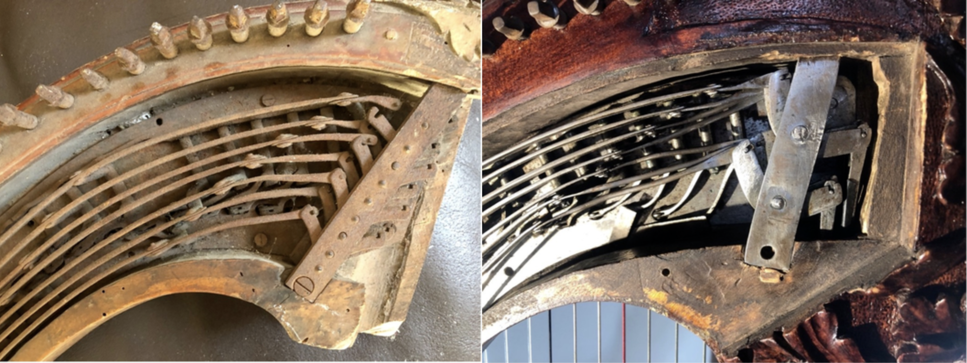 Crochet harps featured an updated version of the pedal spring. As opposed to the relatively rudimentary springs seen on Hochbrucker's instruments, crochet harps included finely constructed flat coil springs, housed still in the knee-block as shown below in figure 7.