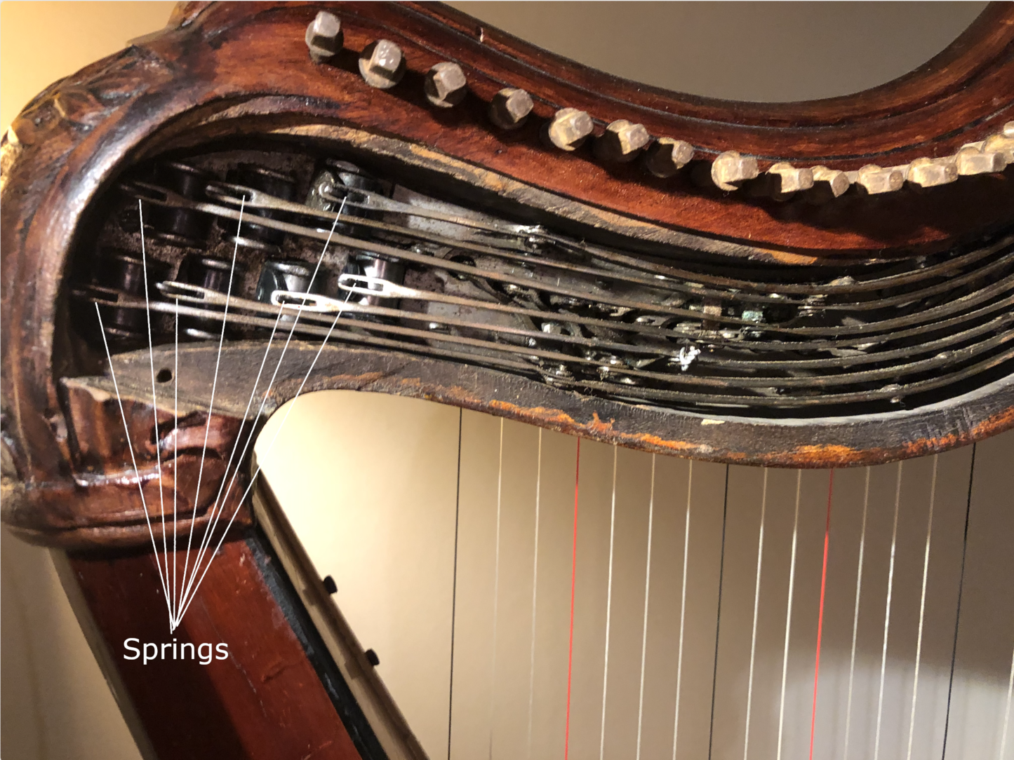 "A great defect in the construction of these harps is, that the action of the pedal, to give the string a second sound, draws it out of the vertical perpendicular, to make it rest upon the neck of the instrument … which lateral motion greatly increases the difficulty of the execution, by destroying the uniformity of the distances between the strings, and tends to put the string out of tune..."1