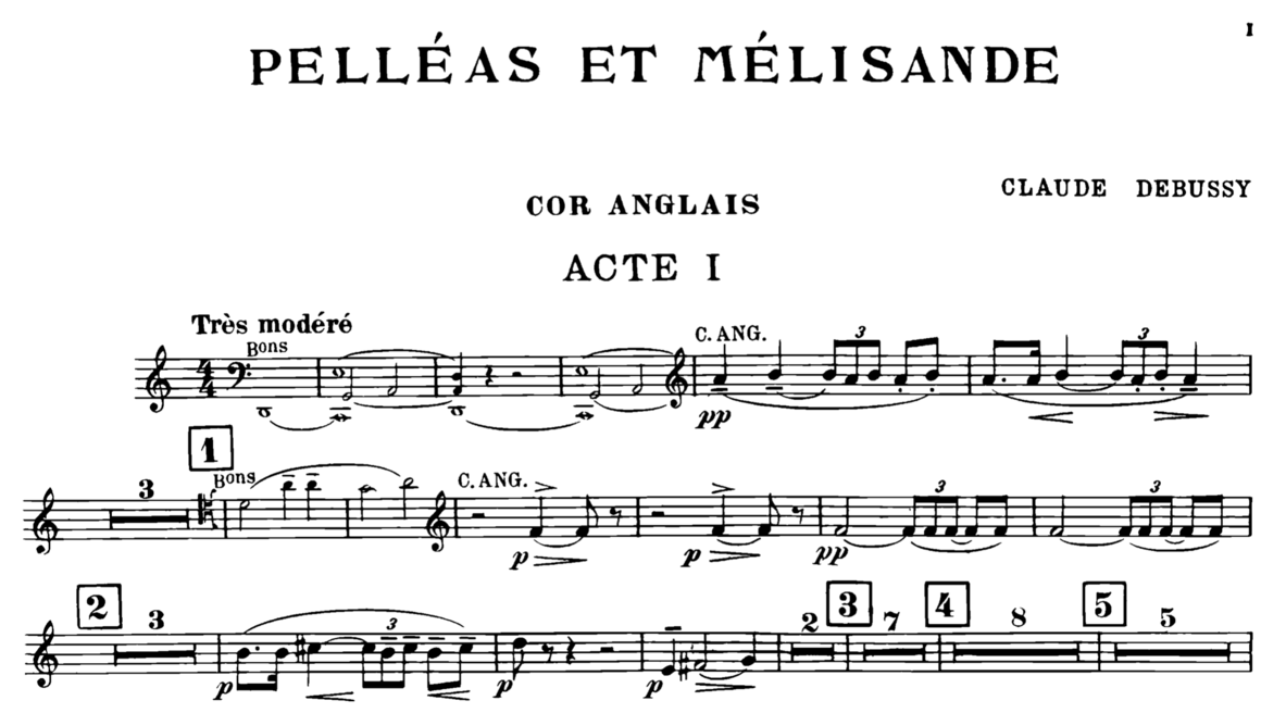 The English horn part of Debussy his only (finished) opera Pelléas et Mélisande (1902), composed on the libretto of the symbolist play (1893) from the Belgian playwright Maurice Maeterlinck. The way Debussy has written down these melodic and rhythmic lines, in a declamation style, inspired me for the musical notation of the transcription.