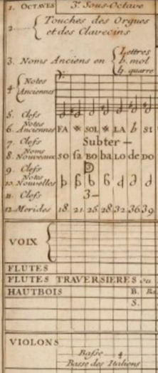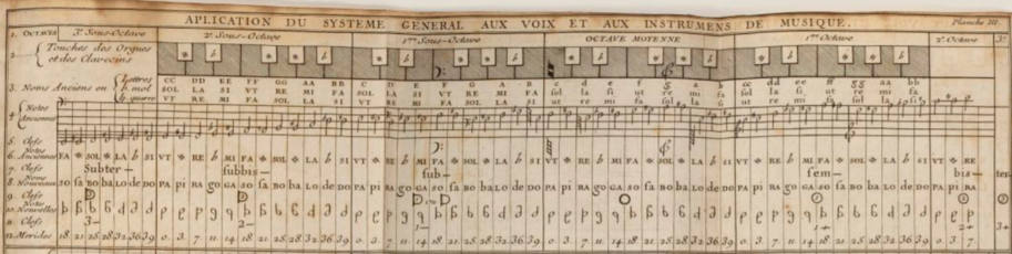 Figures 14 and 15, Table of tunings from the Aplication du systeme general aux voix et aux instrumens de Musique (Planche III) by Joseph Sauveur. Principes d’acoustique et musique (Paris: Academie Royal des Sciences,1701).
