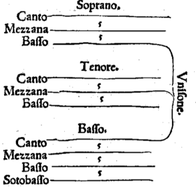 Lanfranco (1490-1545) does not specify the pitches of the instruments, only that the strings should be tuned a fifth apart. He clarifies that the top string of the basso should be in unison with the middle string of the tenore as well as with the bottom string of the soprano.6