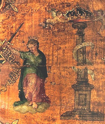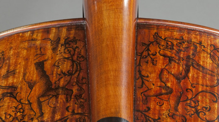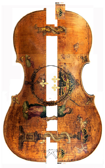 The only parts that remain intact are the scroll and peg-box, the original ones designed and made by Andrea Amati. One could imagine that this instrument was created as a basse de violon because of one evident fact, parts of the ornamentation are missing. These embellishments were related to the king´s mottoes, his family´s, and the emblems of the French court. As an example of one effect of the alteration of the instrument the column at the bottom of the instrument isn´t straight anymore; it suddenly breaks in the middle and starts again a leaning slightly to the right. In addition, the figure of Justice is missing parts of her body. The image on the leftshows how the instrument must have looked before the reduction was made. The missing body parts must have been in the wood removed during the reduction, making the instrument smaller to achieve a violoncello.