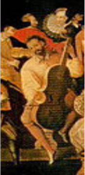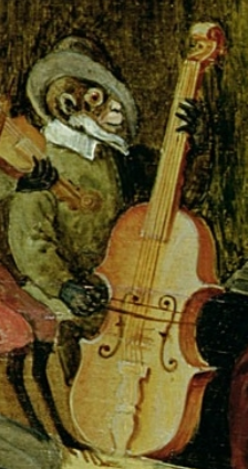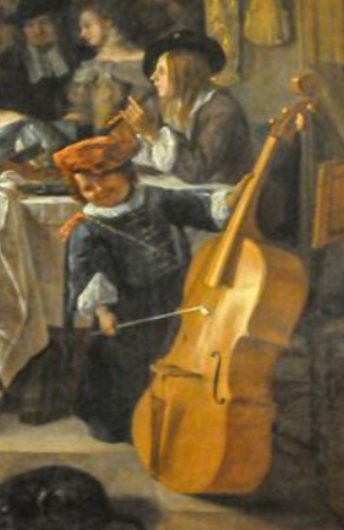 The instrument, leaning to the left of the musician´s body, stays between his knees as in the previous depiction, but this time the instrument sits on the floor. Due to the large dimensions of the basse de violon, it was probably heavy and thus uncomfortable to hold in the legs for a long period. The bowing angle of this musician is diagonal. This way of bowing is a result of the way this musician is holding the instrument.