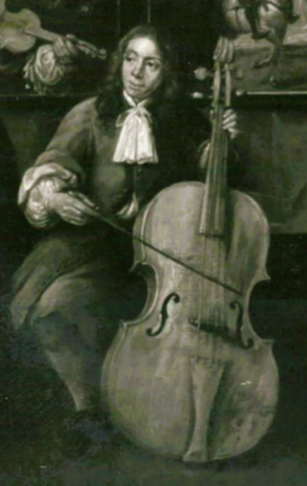 I discovered this for myself while imitating the musician in the painting, it was hard to bow without hitting the instrument or my body. Years later Michel Corrette advises against supporting the instrument in this way: