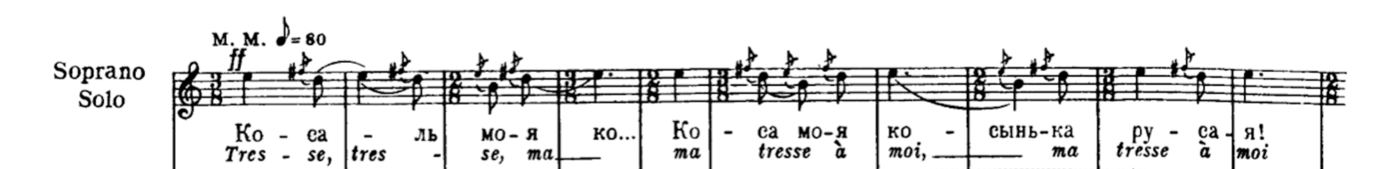 In Les Noces the use of the voice, soloists and choir, brings a whole new vocal approach that imitates folk singing. The connection to Russian folklore aesthetic together with the idea of the lament created a need for a different use of the voice with ornamentation, accents, gliding pitch contour, glissandi, accacciaturas and vocalised breathings8. All these elements were “Stravinsky’s invention as an aural representation of sobbing and wailing, which makes his laments sound indeed like village laments”9. The bride does not sing, but wails10. On the other hand, "the folk manner of choral singing"11 has a faster tempo and no complement of any ornaments, giving the illusion of recitation rather than a melodic vocal line.