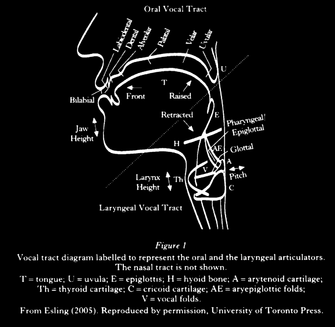 The specialists Jerold Edmondson and John Esling with their laryngoscopic research concluded in six major valves that control the posture of the lower vocal tract and are responsible -among others- for voicing, the quality of voicing , the differences in phonation type for vocal register and the tone4.