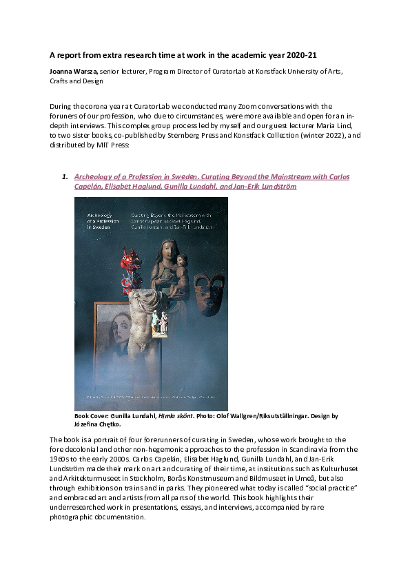 Assuming Asymmetries. Conversations on Curating Public Art Projects of the 1980s and 1990s is a volume based on the dialogues between the curators and participants from some of the most complex and yet underresearched European and US public art exhibitions of the 1980s and 1990s. The discussions include and unpack such influential projects as “Culture in Action” curated by Mary Jane Jacob in 1993; “Sonsbeek 93” curated by Valerie Smith; “Endlichkeit der Freiheit,” an exhibition initiated by Heiner Müller and Rebecca Horn, on both sides of the former Berlin wall in 1990; “Construction in Process,” an artist-initiated site-specific exhibition in early 1980s Łódz, Poland; “Five Gardens” curated by Carlos Capelán in 1996 in Simrishamn and Ystad, Sweden, and “U-media” in 1987 Umeå, Sweden. The dialogues focus on such questions as: How does one ethically and culturally deal with asymmetries? How have the notions of situated or embedded knowledge changed over the last decades? How can artworks actually create meaning from the place where they're produced? What were the early attempts of de-monumentalizing art outside of the museums; and, finally, what actually is non-extractive curating. Both books are edited by CuratorLab at Konstfack University of Arts 2020/2021: Anna Mikaela Ekstrand, Giulia Floris, Vasco Forconi, Edy Fung, Julius Lehmann, Maria Lind, Marc Navarro, Simina Neagu, Hanna Nordell, Tomek Pawłowski Jarmołajew, Marja Rautaharju, Erik Sandberg, Joanna Warsza The process was led by Joanna Warsza and Maria Lind