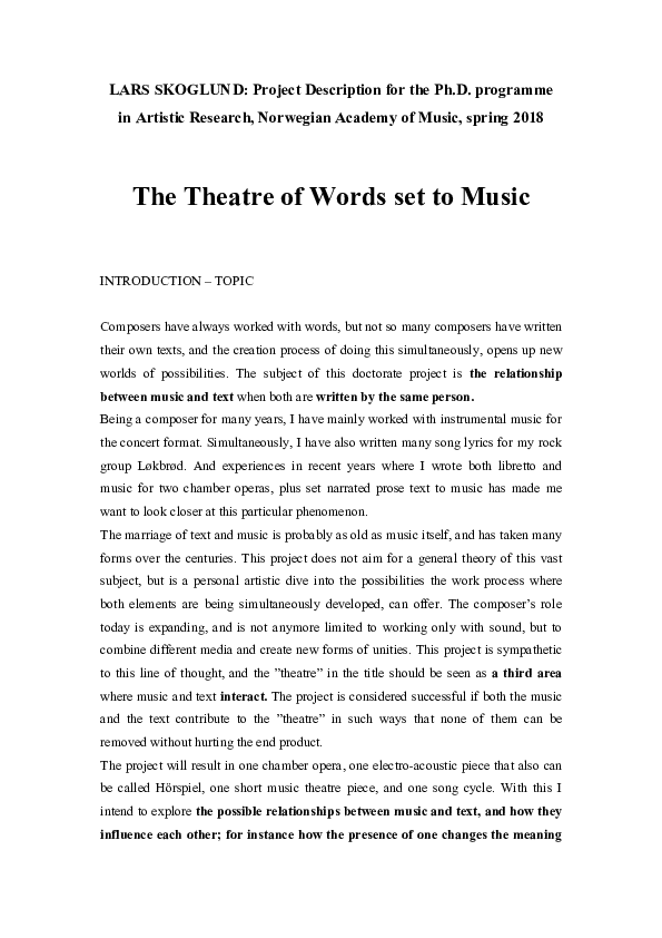 When I started this artistic research in October 2018, as a composer determined to let the everyday life be the main area to explore artistically as a subject, my ambition was to produce several works of art for the stage, with both music and text in central roles and, therefore, with an ambition to write my own libretti. I was going to explore the format of storytelling in musical composition, through the theme of ordinary language and everyday life (“with a twist at some point”), and with the promise that the works and the research would jointly teach us about the relationship between words and music. In terms of specific projects, my initial plan was to make a radio play, a chamber opera, a short music theatre piece and a song cycle.