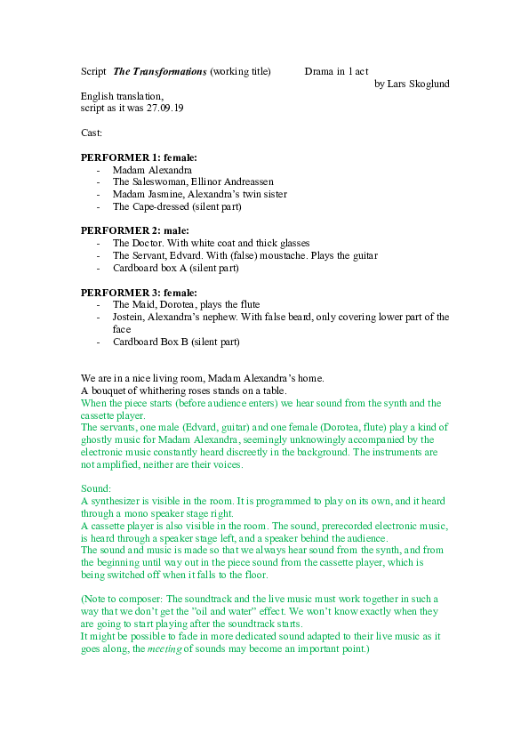 Probably the most strange – and perhaps even unplayable – piece I made during the Ph.d. period is called The Transformations. So far, it only exists as a manuscript for a play. It does, however, have several “notes to composer”, and many of those who have read it have told me how they experienced hearing their own theatre music in their imagination while reading the stage directions.