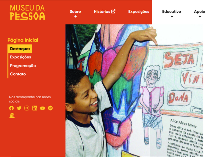O Museu da Pessoa é um museu virtual e colaborativo de histórias de vida aberto à participação de toda pessoa. Lá você pode contar sua história, organizar suas próprias coleções e conhecer histórias de pessoas de todas idades, raças, credos, profissões do Brasil. Fundado em 1991, o Museu da Pessoa acredita que contar, escutar, conhecer e preservar histórias de vida pode mudar seu jeito de ver o mundo. (Fonte: Museu da Pessoa)
