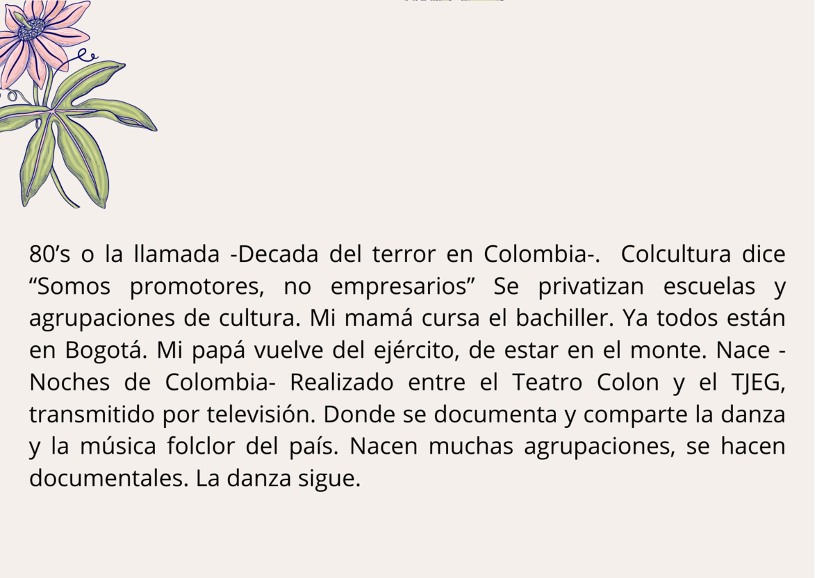 Este es un recorrido genealógico construido desde el momento en que empiezo a bailar danza folclórica en el escenario hasta el momento en que abandonó las compañías. Esto sucede del 2004 hasta el 2019. Es un viaje narrado desde la voz a partir de las texturas de imágenes, sonoridades y sensaciones que se activan en la memoria al preguntarme por cómo me he construido como mujer a partir de este lenguaje. La danza folclórica que me ha llevado a habitar espacios como el escenario, el salón de ensayos, festivales, territorios por Colombia, fuera de Colombia, territorios como yo misma, territorios que van más allá de lo físico y terrenal, que me conectan con un espacio que va más allá de la vida y la muerte. La danza folclórica que saca a esta mujer de su casa y que me ha dado la rebeldía y fuerza para la agencia de mí misma. La danza folclórica que también me ha hecho competitiva, me ha creado un ideal de mujer, de cuerpo, me ha dejado detrás del hombre, que me ha invisibilizado como creadora, me reduce a un estereotipo de mujer. La danza folclórica en lo teórico y discursivo desde lo patriarcal, hegemónico, colonial, racista. También lo que ha sido la danza folclórica para mí desde las tradiciones de mi familia, la resignificación de esta danza, la resignificación de mí misma.
