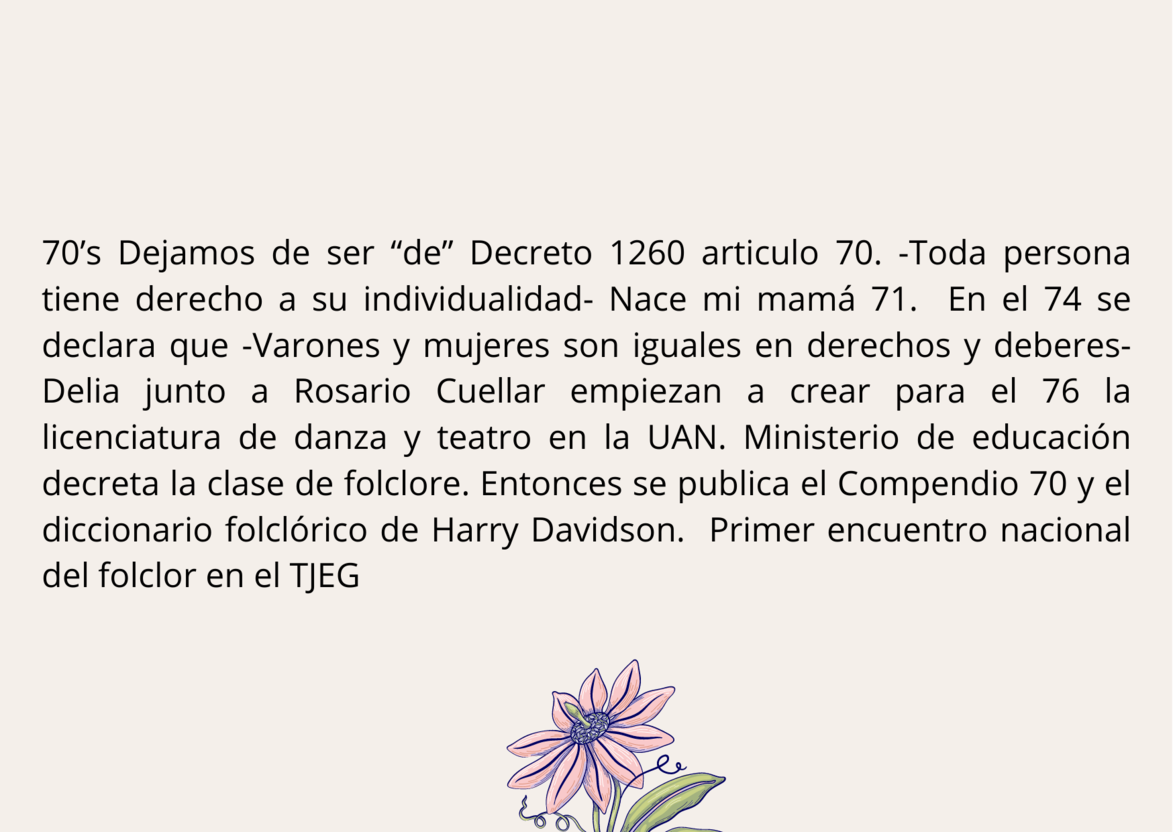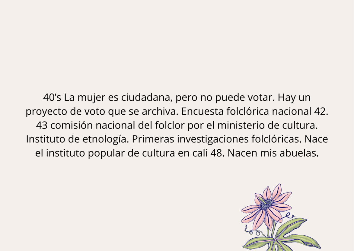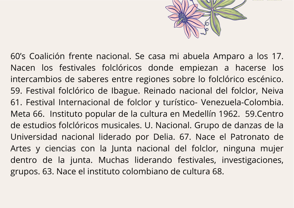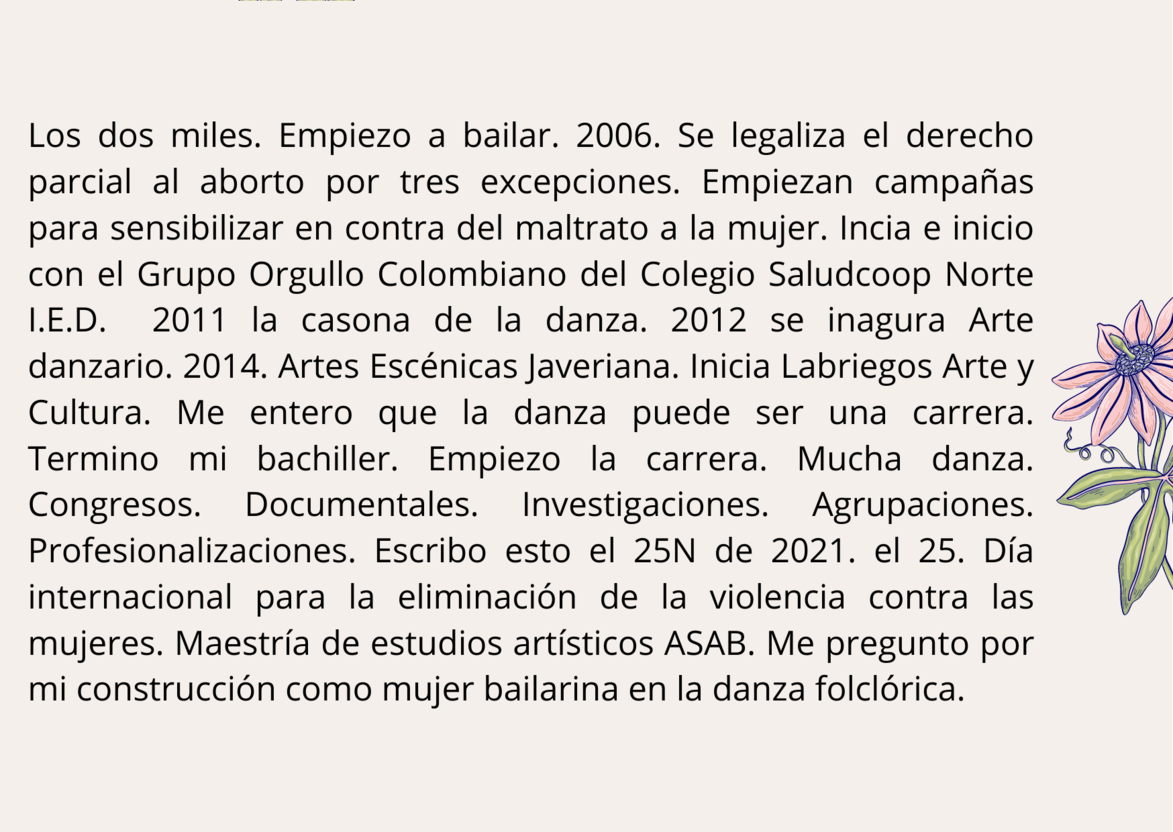 En estas diapositivas usted podrá encontrarse con un tejido histórico entre: la institucionalización del folclor en Colombia, los derechos de la mujer en el país y los principales momentos donde se ubica mi historia personal. Se toca la profesionalización en danza para situar mi llegada al ámbito artístico desde lo institucional.