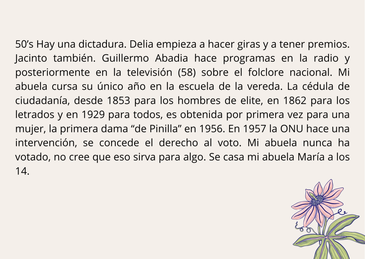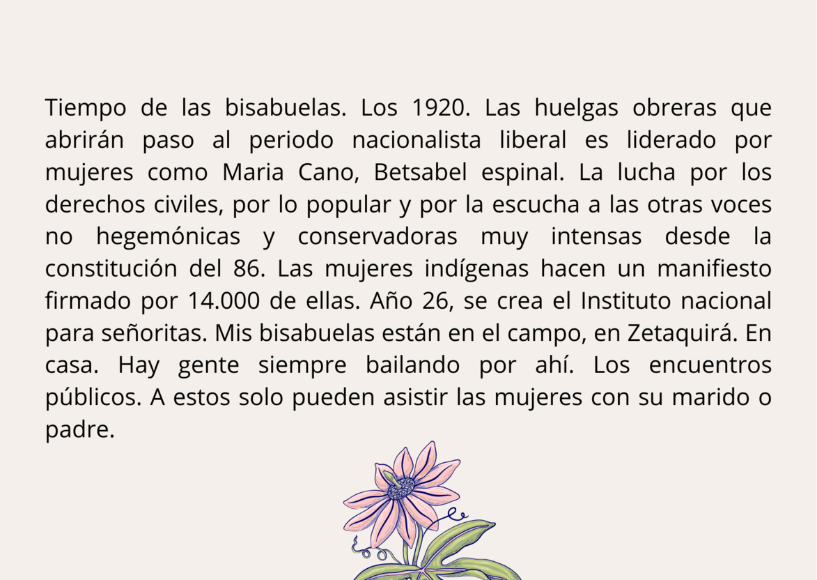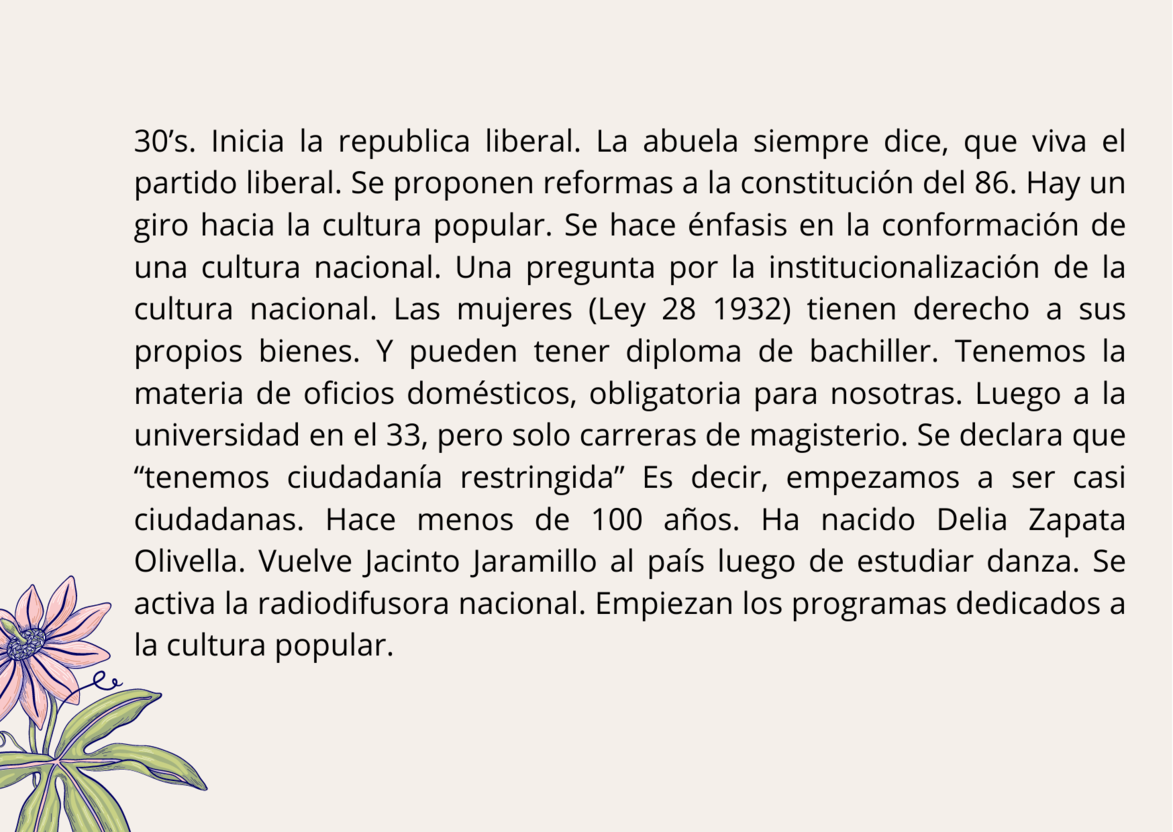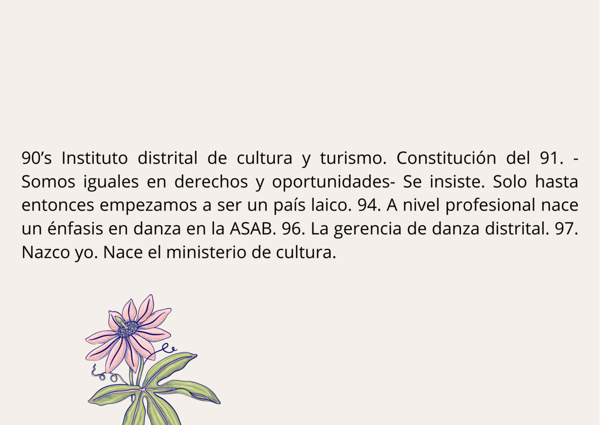 En estas diapositivas usted podrá encontrarse con un tejido histórico entre: la institucionalización del folclor en Colombia, los derechos de la mujer en el país y los principales momentos donde se ubica mi historia personal. Se toca la profesionalización en danza para situar mi llegada al ámbito artístico desde lo institucional.