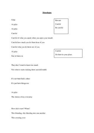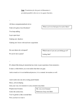 However, translation of the words in Romanian (in this particular case) is provided for the creative team and the collaborators to the performance score with the purpose of understanding the content, which will in turn influence and shape what aesthetic solutions we find for the visual, sound and other accompanying languages throughout the performance.