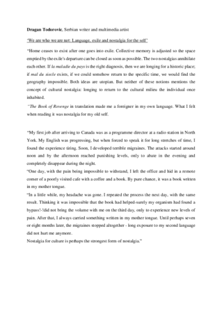 Other texts to be exhibited could be fragments from writings or quotes by various bilingual/multilingual writers or artists who wite about living in exile, the notion of 'home' or belonging. A brief example with two such authors can be found below: