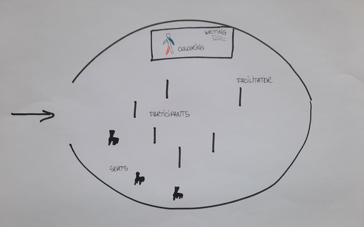 -the participants will then be led into a guided exercise where they will be invited to associate languages to parts of their body and to attribute colours to the various languages they speak - this is meant to invite participants to find an embodiment for the different linguistic identities living inside them, to give those a form that they themselves can control, play with, observe, and to see how the different langauges can co-exist without. Special attention must be payed so that we don't imply that there is a definitive resolution for how languages manifest in our (their) identities or that they occupy an equal space - that would be innacurate, as every participant's personal history differs from one another. It is rather an acknowledgement of the existence and value of each of those languages (both-and rather than either/or).