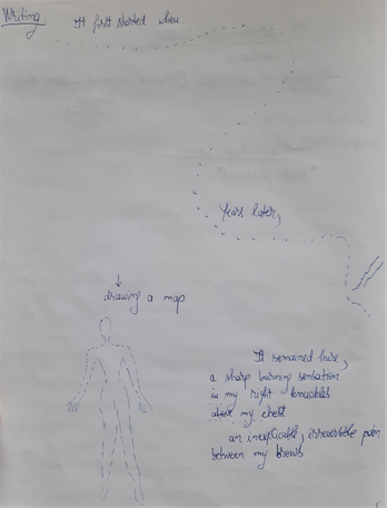 The participants will be invited to reflect on the guided exercise (and/or the entire experience) through a free flow writing exercise. They can do this stream of consciousness writing with their eyes open or closed, using the outline drawn earlier to write over or separate sheets of paper.