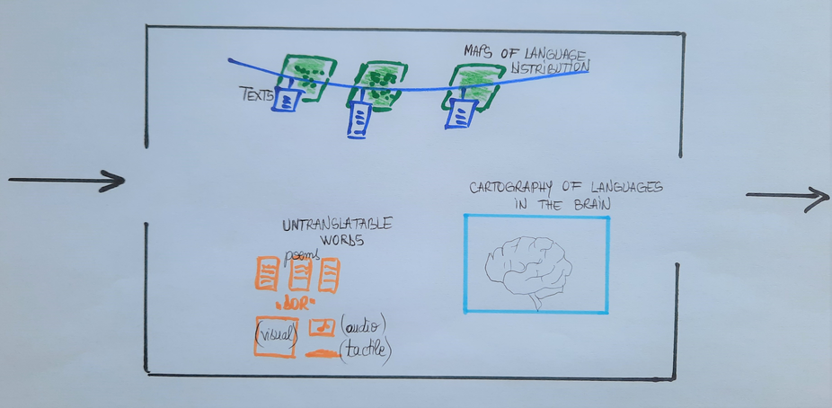 In the gallery space, the audience will have the possibility to experience language in different forms language - in the shape of written text, maps of the distribution of different languages, cartography of different languages in the brain.