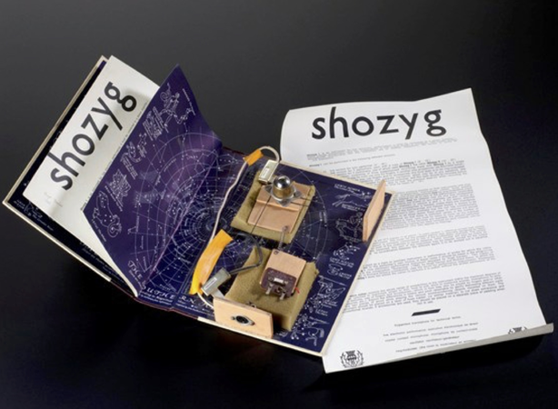 In 1968 Davies produced one of his first successful self-contained instruments, the Shozyg I (fig.6), which consists of the last tome of the encyclopedia – volume 13, which includes entries from “Shoal” to “Zygote”, thus from “Sho” to “Zyg” – whose pages had been hollowed out to make space for objects mounted on its inside back cover. The objects inside – a ball-bearing, three fretsaw blades of different length, and two different springs – were grouped in two areas, and each group is amplified by a piezoelectric pickup, chosen according to its filtering characteristics. The objects were played using fingers, fingernails, screwdrivers, needle files, toothbrushes, small electric motors, etc. According to Palermo, Davies had begun using piezoelectric microphones “at least since the establishment of the Goldsmiths Electronic Music studio in 1967, which had two piezos in its initial equipment, and he used these to amplify all kinds of object (combs, broken light bulbs, springs), then recording Galactic Interfaces as a result” (email from Fiorenzo Palermo - 25 May 2019).