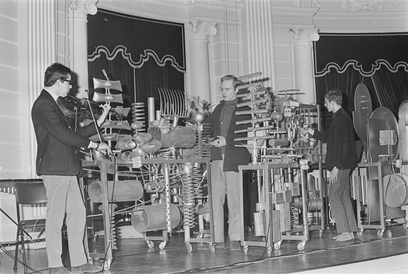 The picture from The Memory of the Netherlands Database (fig.1.9.1) – an online heritage collection of Dutch historically relevant paintings, drawings, stamps, posters and photographs – was probably taken during the shooting of the movie, since the location looks alike. The Memory of the Netherlands Database dates the picture March 14th, 1966, but it does not mention the movie. In the newspaper San Francisco Examiner (July 17, 1966) it is possible to find a similar picture, which caption mentions the Artaudofoon as the percussion instrument “unveiled last week” (unfortunately the dates do not match perfectly), but without any reference to the occasion in which the picture was taken.