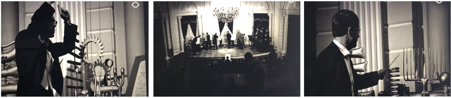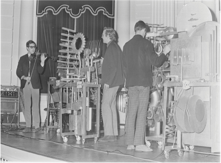The idea of amplifying metal sounds with contact microphones was also applied by the Dutch composer Peter Schat (1935-2003). Early in his career, with the help of the sculptor Frans De Boer-Lichtvelt and the technician Jo Scherpenisse, he designed an instrument named Artaudofoon. In the '60s Peter Schat was part of a group of politically engaged young composers that included Misha Mengelberg, Louis Andriessen, Dick Raaymakers, Jan van Vlijmen, Reinbert de Leeuw, and Konrad Boehmer, who founded the “Studio voor Elektro-Instrumentale Muziek” - STEIM.1 Nico Bes – who worked at STEIM as a technician since 1971 – recalls that one of his first experiences with the technology of contact microphones was the Artaudofoon.2 The instrument, as the name suggests, was inspired by the Theatre of Cruelty of Antonin Artaud, and consisted of five metal sculptures, whose sound was amplified by contact microphones attached to them. According to Jo Schepernisse,3 Schat used military throat-microphones (used by helicopter-pilots). The history of this huge instrument is controversial. As recounted by Bas Van Putten in Peter Schat's biography, the idea of this project started in 1965, when Peter Schat obtained a grant from the Prince Bernhard Fund. While working on his opera Labyrinth4 he developed the idea of building a huge electro-acoustic percussion instrument, equipped with many “contact microphones, a filter, a modulator, an amplifier and a set of loudspeakers” (Van Putten 2015, p.381). In September 1966 Schat also tried to get funding from Philips because the instrument was presenting many technical problems and he had underestimated the costs of the electronic parts. In 1966 Schat received a commission by the Rotterdam Art Foundation to write Electrocution, which should have been - in Schat's original idea - a total theatrical work, using the Artaudofoon as the percussive instrument, but this work was never written. Nevertheless, in Schat biography, Van Putten mentions the movie The Gangster Girl (1966) by Frans Weisz,5 in which a scene of a concert – filmed in the Kleine Zaal of the Concertgebouw of Amsterdam – features a composition played by the Artaudfoon and three double basses (see video excerpt). According to Van Putten, Peter Schat played two roles in the movie: “the Stranger", a guy who falls in love with the gangster's girl, and the role of the conductor of his own music for Artaudofoon (Van Putten 2015, pp.386-389).