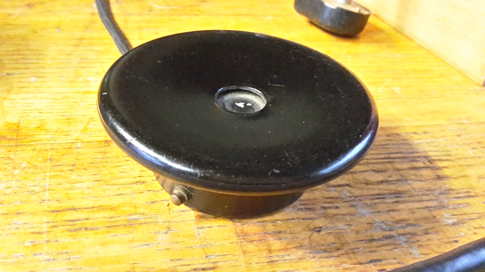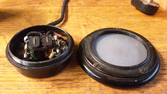 GWR: Well, I have an original Hugh Davies here: look (fig.4) there’s his signature and the date. It’s a real Hugh Davies’ springboard. An original one: I bought it from him in ’74. But this is not piezo. Hugh Davies almost never worked with piezo. He was always working with these magnetic transducers, and he gets them from this (fig.5). This is an old headphone, before the Second World War, and what is inside: there is a membrane in here, a very thin steel membrane, and here there are these two coils on the u-shaped magnets, and when you send the signal to it, because of the magnetism, the membrane starts to vibrate, and you can listen to it. But it’s reversible. It’s a perfect microphone. It’s the same microphone used here. He took them from these old telephones and used them as pickups. You just unscrew it, it’s easy to take it off. It works by induction, this is a permanent magnet, so a metal object that moves in front of the magnet induces an electrical current in proportion to the vibrations of the spring, and you get an electric voltage on the output immediately. The advantage is that it is a non contact device because it makes no physical contact with the spring. With the piezo you always have to make a physical contact, you have to attach something to it, whereas this works at a distance: basically it’s the same system of a microphone used on an electric guitar, it’s only much smaller and you can go to a tiny object with this. I know Hugh Davies had hundreds of these things because he bought them at the flea markets, always. From headphones, old telephones also had them…