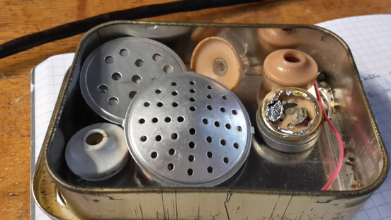 GWR: or the predecessors of piezo! I came in contact with piezo actually in an indirect way. The first piezo element was seignette salt, it was very hygroscopic. If it gets wet it’s lost forever. These old elements you won’t find anymore because they wouldn’t work. Because of humidity, they deteriorate after a while. But those are the first ones that were used as contact microphones, as headphones also, cheap earphones, crystal radios. These are old headphone pieces with seignette salt that are actually broken (fig.1).