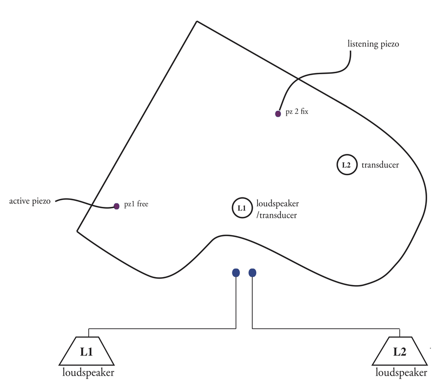 Instead of seeking to highlight different sound planes, foregrounding the different proxemic of piezo-sounds, PianoMusicBox_1 aims to concentrate on the inner sounds of the instrument and its hyper-materiality. PianoMusicBox_1 has been written for and in collaboration with the pianist Chiara Saccone, and it was premiered during the festival “Collaborations are More Refreshing than New Socks”, at the Royal Conservatoire of Antwerp, on December 4th, 2019. The amplification strategy includes the use of two piezos – one is given to the pianist for the production of sounds and the other one is fixed on the soundboard, providing information to the electronics. The first piezo produces sound while amplifying – and sometimes as input to the live-electronic processes. In addition to the piezos, two transducers are placed inside the stringboard of the piano to create a closed system, in which both the acoustic instrumental and live-processed sound are amplified through the body of the instrument. In this way the piano becomes the only sound source. (In the case of performing the piece in a very big room, a couple of microphones and a stereo set of loudspeakers might be used to reinforce and better project the sound of the piano in the space (fig.3.3.3).