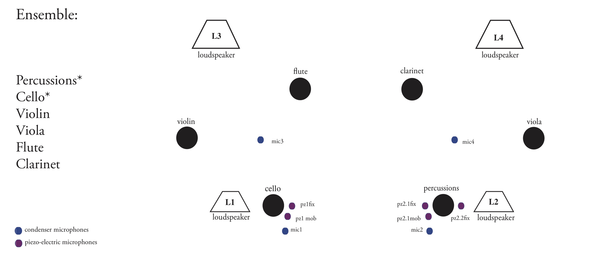 Residual was commissioned by Hermes Ensemble, and premiered at the Concertgebouw in Bruges, on November 21st, 2019. With this work I have worked with space at a compositional level, exploring the possibility of working on two different planes of sound: one in the foreground, and the other in the background. The cello and the percussion (timpani, marimba, güiro, crotales) are the instruments in the foreground, which act almost as soloists. The cello is provided with one piezo, which has to be used to play different gestures on the instrument, and another which has to be fixed on its body with the purpose of amplification. Concerning the percussion, one piezo has to be fixed on the surface of the timpani, another on the lowest C-key of the marimba and a third has to be used to play the crotales and the güiro. Both percussion and cello are primarily amplified with piezos, although a condenser microphone is added, in order to smooth the color of the piezo. The rest of the ensemble – flute, clarinet, violin and viola – is arranged in a semi-circle behind the soloists and is amplified only with a pair of condenser microphones, with a sort of transparent amplification, i.e a light reinforcement of the instrumental sound. In order to emphasize the perception of these two different planes, cello and percussion are amplified through their own loudspeakers, placed next to them. In this way, both the sound of the acoustic instrument and its amplification are projected in the space from almost the same spot. The rest of the ensemble is instead amplified through a pair of stereo loudspeakers placed behind the ensemble (fig.3.3.2).