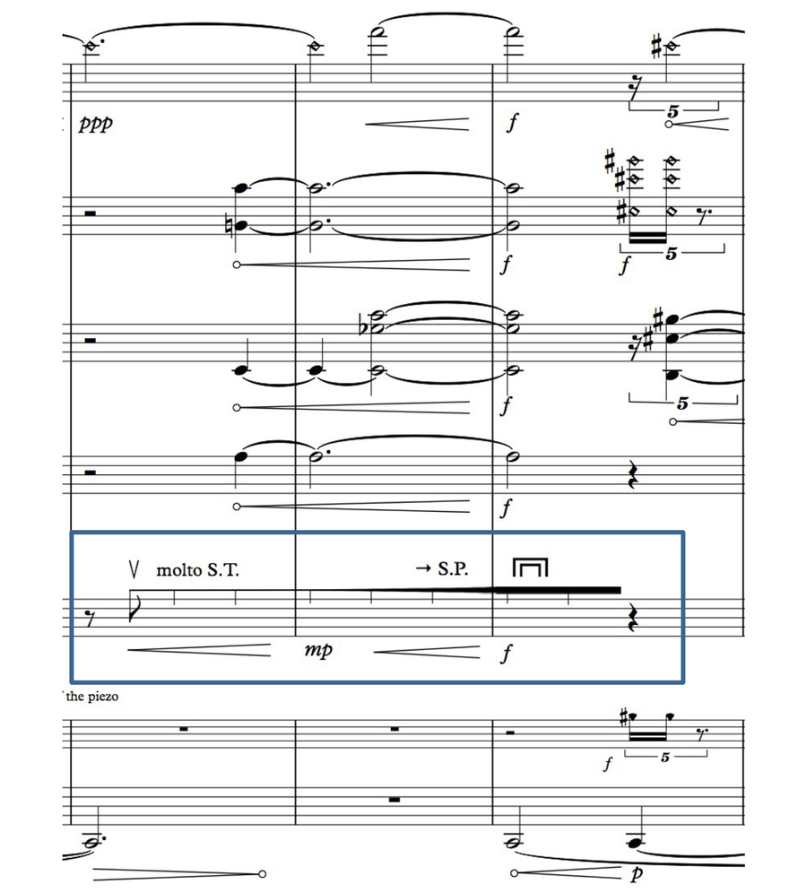 The hyper-amplification of the instrumental matter through piezos provides a significant shift from the usual auditory feedback. Using piezos implies the most close-miking technique, which picks up the sound of the instrument directly from the vibrating surface of the instrument, isolating it from other sound sources, and minimizing the ambient sound. Moreover, due to their very specific acoustic properties (as already explained in chapter 2) piezos filter the instrumental sound, conferring on it a very peculiar colour, while clearly revealing the sonic presence of the technological tool between the acoustic sound of the resonant object and the human ear. So, the instrumental sound matter amplified and produced with the piezo gains a new sense of proximity. This term has the same root as the word "proxemics", which refers to the study of the human use of space within different cultural contexts. This term was introduced by the anthropologist Edward T. Hall. In his essay The Hidden Dimension (1966) Hall developed a theory of proxemics, arguing that human perceptions of space, although derived from sensory apparatus that all humans share, are culturally patterned. Hall observed how different cultural frameworks for defining and organizing space are internalized at an unconscious level, and they can produce misunderstanding within communication in cross-cultural settings. In a similar way, I would argue that the perception of amplified instrumental sounds is internalized at an unconscious level according to a few constant aural habits. The way piezos amplify instrumental sound creates a moment of disruption in this usual perceptual pattern. This uncommon sense of proximity means that the sound produced with piezo is perceived as strikingly close, generating a different proxemics of sounds. Fig.3.3.1 shows bb.198-200 of Residual, a piece for ensemble and electronics, in which the cello performs an action involving the piezo.