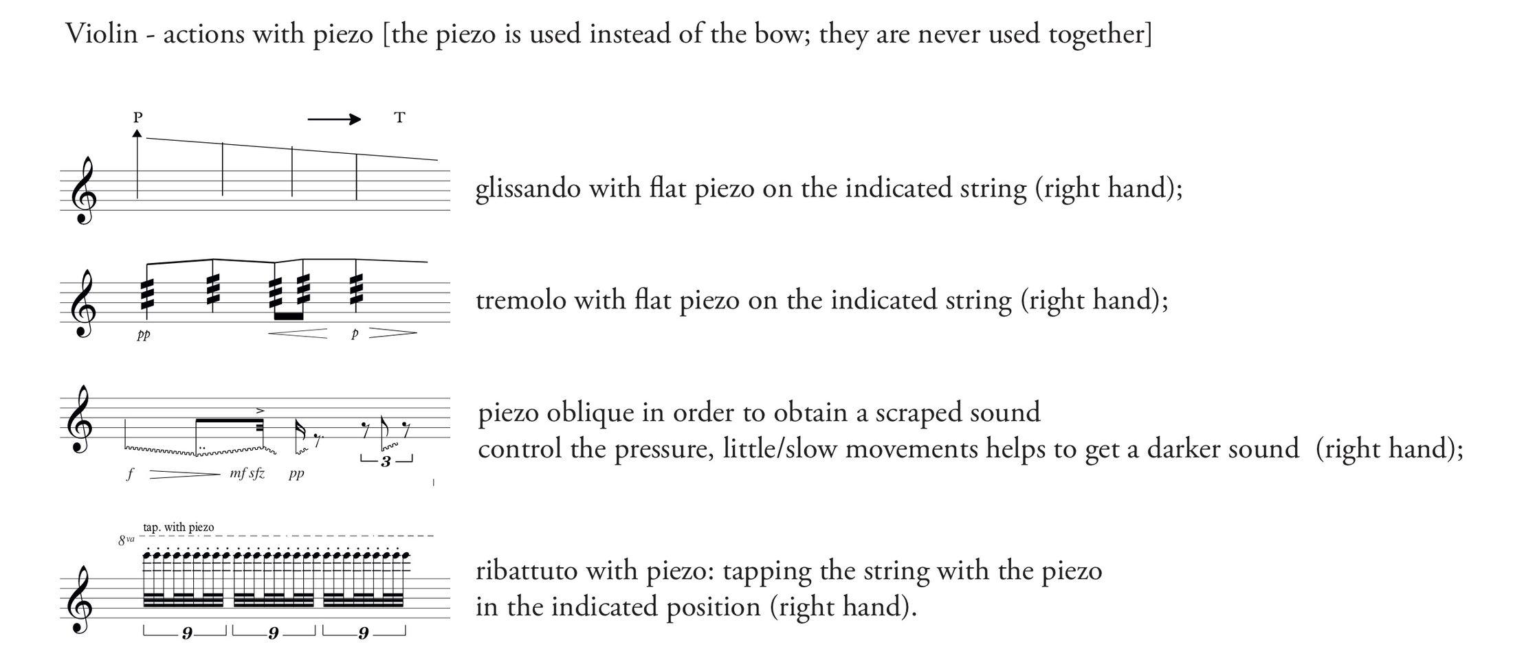 All these sound gestures are the results of a deeper exploration of the possibilities offered by the use of the piezo on the instrument. I spent a lot of time trying all these gestures by myself, recording them, cataloguing and listening back to them, reflecting on their potentialities in terms of sound material. Once I had defined them in a quite precise way, I discussed them with the performer in order to double-check their feasibility. Their execution requires extra effort from the performer, who needs to adjust his/her way of playing in order to be able to get control over these gestures, which imply the use of piezo.