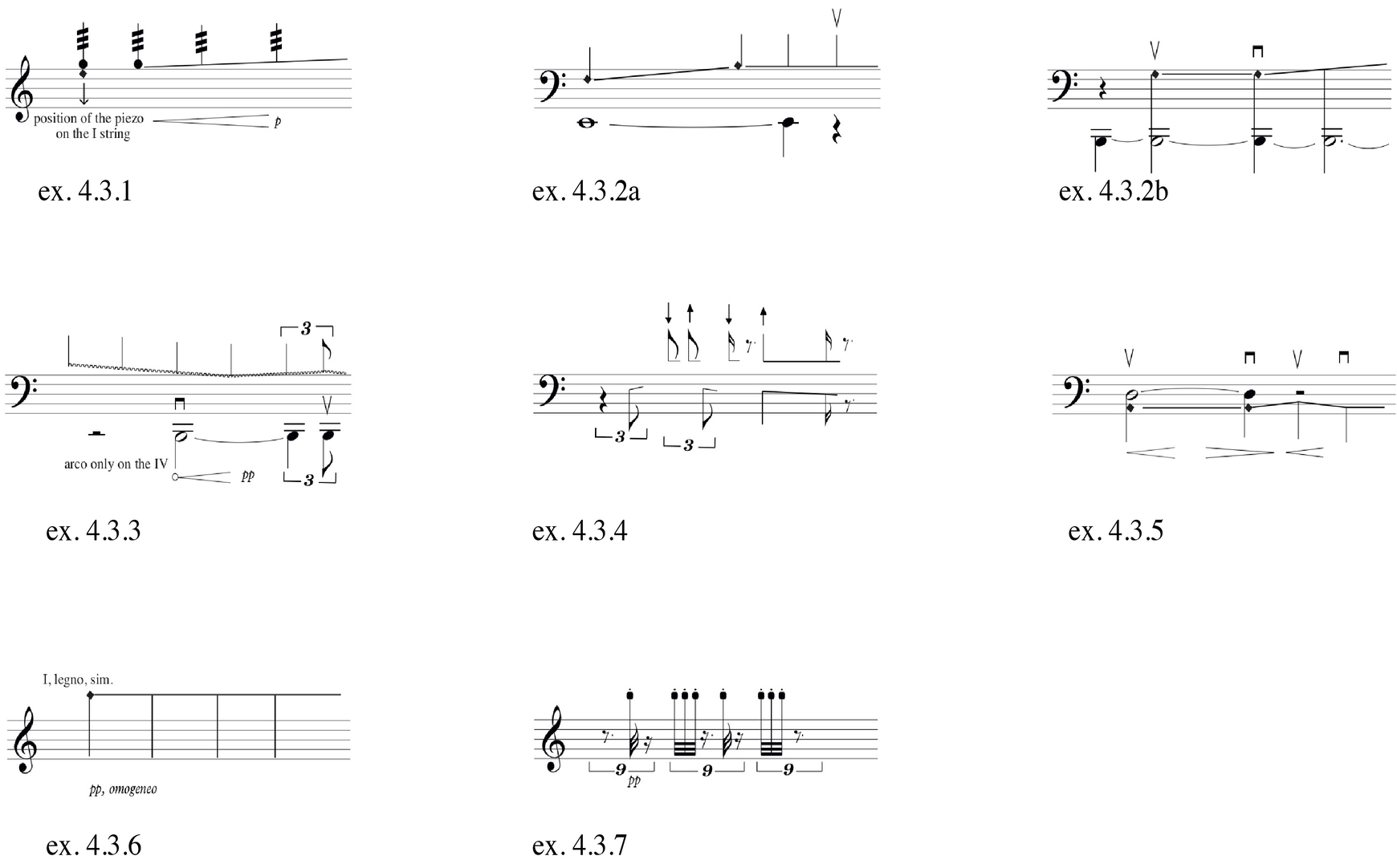 6. The right hand plays with legno on the same string where the piezo has been placed at a high point between the bridge and the fingerboard. The resulting sound should be very airy (ex.4.3.6).