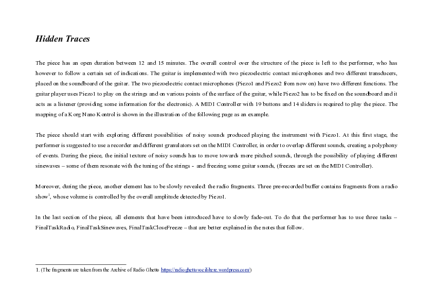As already mentioned in ch. 3.4, Hidden traces is an open-form piece, for which the performer receives a set of indications regarding the formal structure (see Hidden Traces Notes). The latter consists of three main sections and the set of instructions gives information on the timing for using a certain number of pre-determined processes and materials. The piece should start by creating an initial texture of noisy sounds, which has to move gradually towards a polyphony of more pitched sounds, through the possibility of freezing some guitar sounds and playing back different sinewaves, which will differently resonate with the tuning of the strings. The pre-recorded material starts appearing from the middle of the piece, and it consists of human voices that slowly emerge from the sound texture. The pre-recorded sounds are fragments belonging to different radio shows, broadcasted by Radio Ghetto.* The fragments selected for Hidden traces are in different languages and their content is never recognizable during the piece. The dynamic and the duration of the reproduction of these “traces” depends on certain parameters of the sound gestures produced by the moving piezo, identified by the fixed one, which "listens" to how the guitar is resonating. The control is therefore left to the performer, who can decide how much of these fragments should emerge from the sound texture.