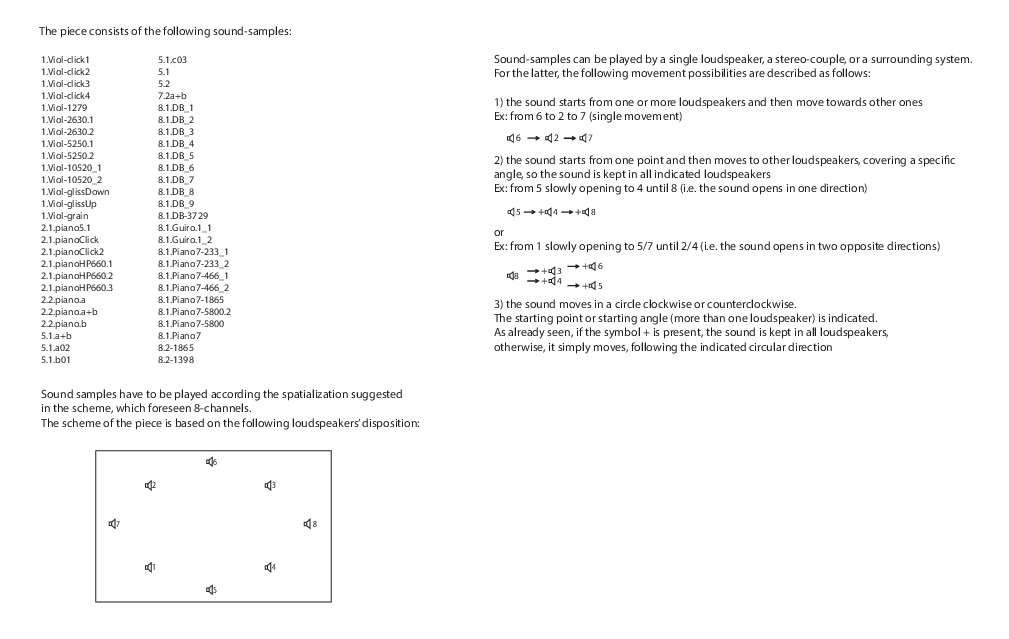 A peculiarity of this work is that during the compositional process, I did not produce a score: the project of the piece was created directly in the editing program (Reaper). A scheme of the piece was deduced only after its composition, from the final version of the fixed media. It mostly delivers information about when samples appears and how are they distributed around the eight channel surround system (see pdf 4.7). Movements of the samples are of different kinds: they might be played back as a point from a single loudspeaker, or they can move from a loudspeaker to another one, also making a full circle (clockwise or counterclockwise); they can otherwise move covering a specific angle, or they could be assigned to a stereo pair or to a specific section of loudspeakers. The acoustic space is therefore constantly reshaped by multiple combinations of different sound materials.