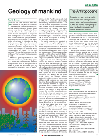2008 fand die stratigraphische Kommission der Geological Society of London, der weltweit ältesten geowissenschaftlichen Vereinigung, überzeugende Argumente für die These, dass das als Holozän bezeichnete zwischeneiszeitliche Zeitalter mit stabilen Klimaverhältnissen an sein Ende gelangt und in einen stratigraphischen Abschnitt eingetreten sei, für den „in den letzten Millionen Jahren keine Entsprechung zu finden sei“. Hierbei spielen der Anstieg der Produktion von Treibhausgasen, die menschengemachten landschaftlichen Veränderungen, welche in ihrem Umfang derweil die natürliche jährliche Sedimentproduktion erheblich übertreffen, die Übersäuerung der Ozeane sowie die fortdauernde Vernichtung von Biota eine Rolle. Sie warnen davor, dass „die Kombination von Artensterben, globaler Artenwanderung und der verbreiteten Verdrängung natürlicher Vegetation durch landwirtschaftliche Monokulturen ein unmissverständliches biostratigraphisches Signal unserer Zeit darstellt. Diese Auswirkungen sind bleibend, da die zukünftige Entwicklung auf den überlebenden (und häufig anthropogen verschobenen) Beständen aufbaut."