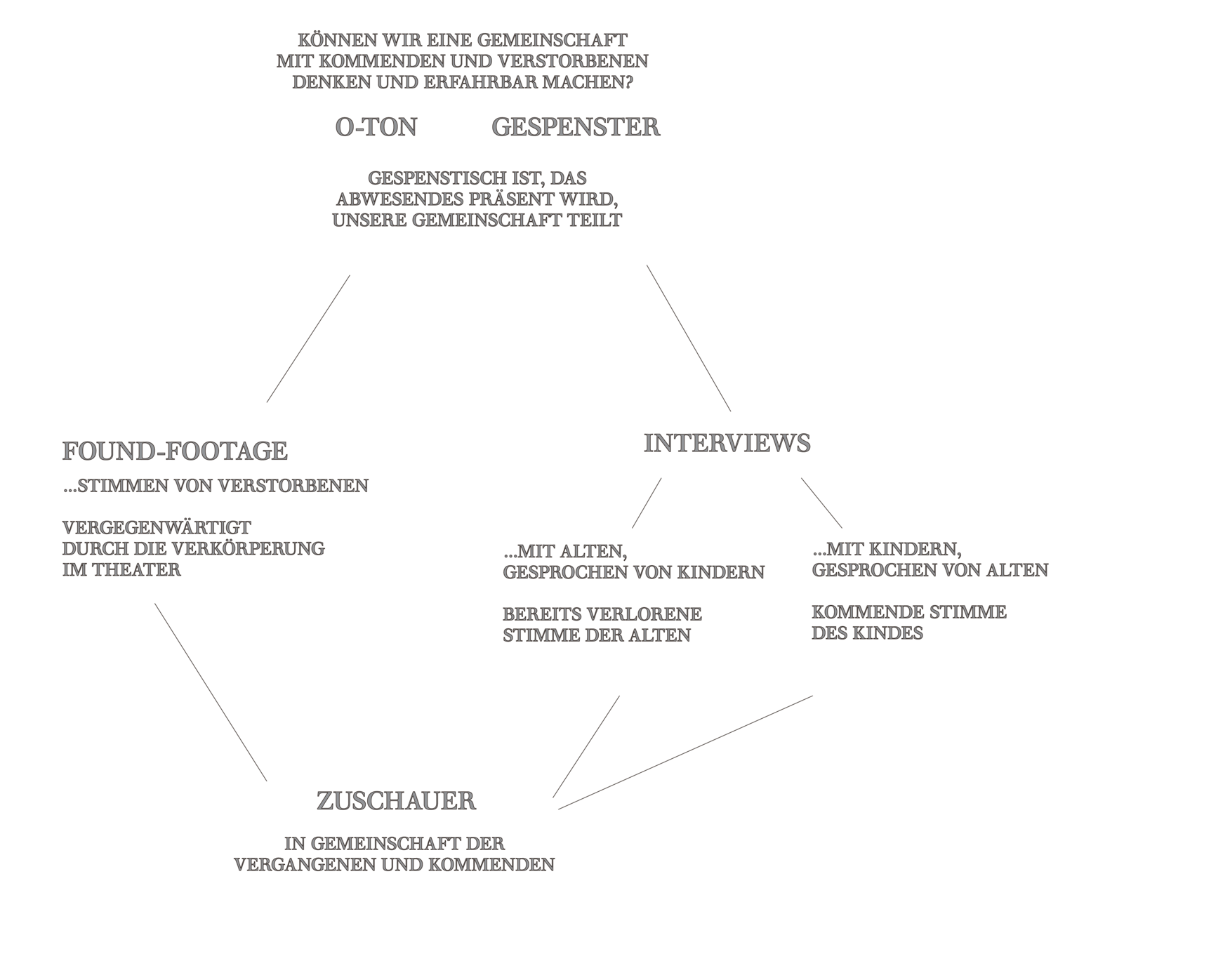 Nur beim Sterben bleibt das Feld scheinbar uns selbst überlassen, uns Einzelnen. Oder können wir von den Gespenstern nicht nur das Leben, sondern auch das Sterben lernen? Können wir unter ihren Blicken denken lernen, dass wir uns in der Masse derer aufhalten, die vor uns waren und die nach uns kommen? Diese Sicht lenkt die Aufmerksamkeit auf das Leben als Teil einer Gemeinschaft der Menschen über die Zeit. Aus unserer künstlerischen Forderung heraus, dem Sterben und dem Tod eine dringend notwendige Kultur zu geben, soll das Theater hier unser Medium sein, die Gespenster in Erscheinung treten zu lassen und sie mit uns in Kontakt zu bringen. In einem Abend der Gemeinschaft aus anwesenden und abwesenden Stimmen, wollen wir uns endlich dem Sterben näher bringen. Denn wir wollen nicht länger getrieben und gescheucht sein von unserer auf unendliches Wachstum und permanente Erneuerung ausgerichteten Gesellschaft, wir dürfen nicht länger abgehalten werden von einer absolut unverzichtbaren Lebensaufgabe eines jeden Menschen: nämlich seine eigene Endlichkeit anzuerkennen und mit ihr umgehen zu lernen.