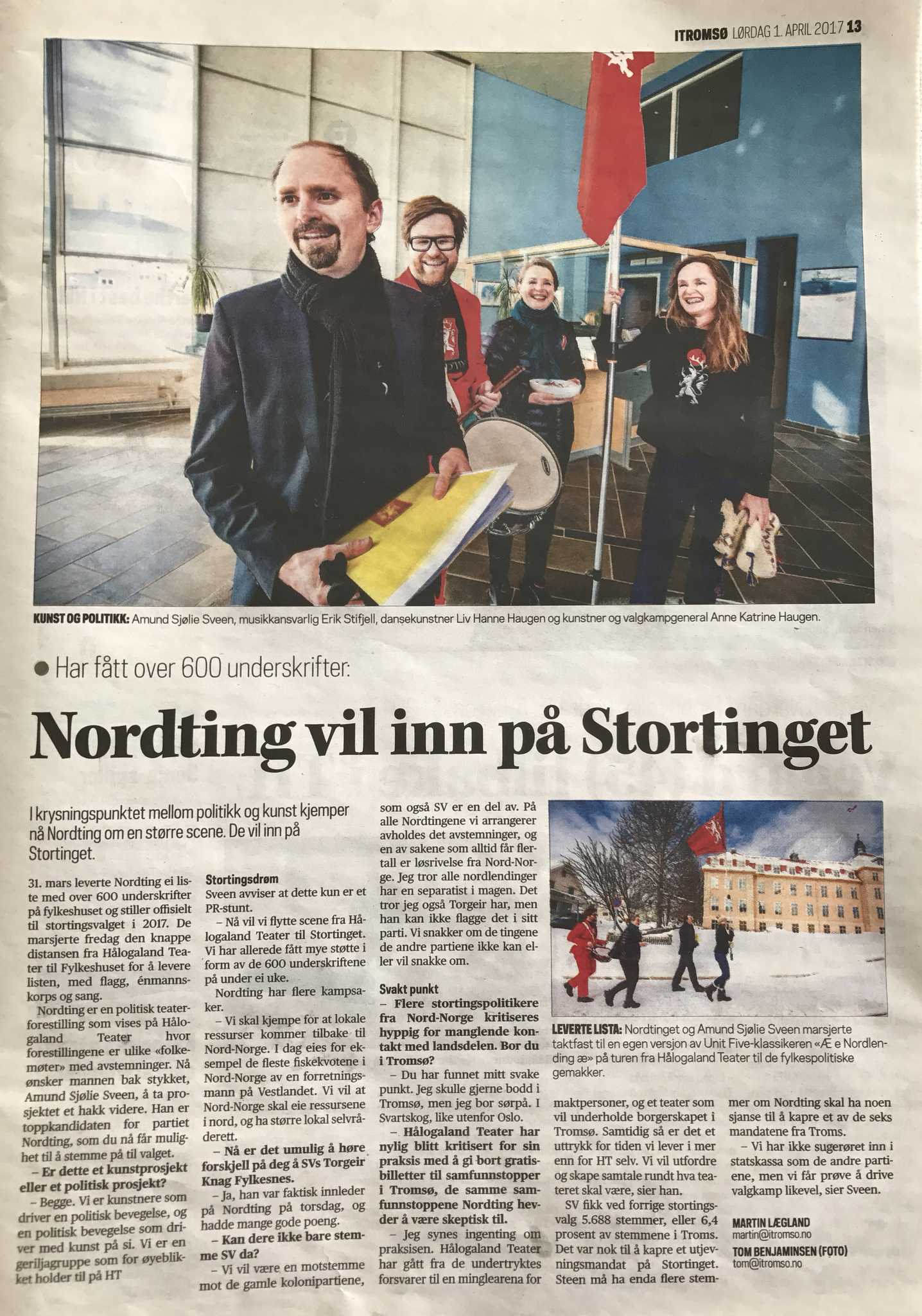 █ Spørsmålet om hva som er kunst og ikke, har vært provoserende i alle fall helt siden det pissoaret i forrige århundre. Kunstrommet (teateret, galleriet) gir oss fantastiske muligheter til å dyrke kunsten, til konsentrasjon og kontemplasjon. Men hvis kunsten skal ha kraft, må den også ut av kunstrommet. █ Det aller første NORDTING i 2014 hadde sprengkraft fordi virkeligheten — fiskeripolitikk, Kjell Inge Røkke og kultursponsing — ble flyttet inn i kunstrommet, inn i Harstad Kulturhus. Selve virkeligheten var ikke overraskende, men det å møte denne virkeligheten i en sammenheng der man ikke forventet den, det var overraskende.