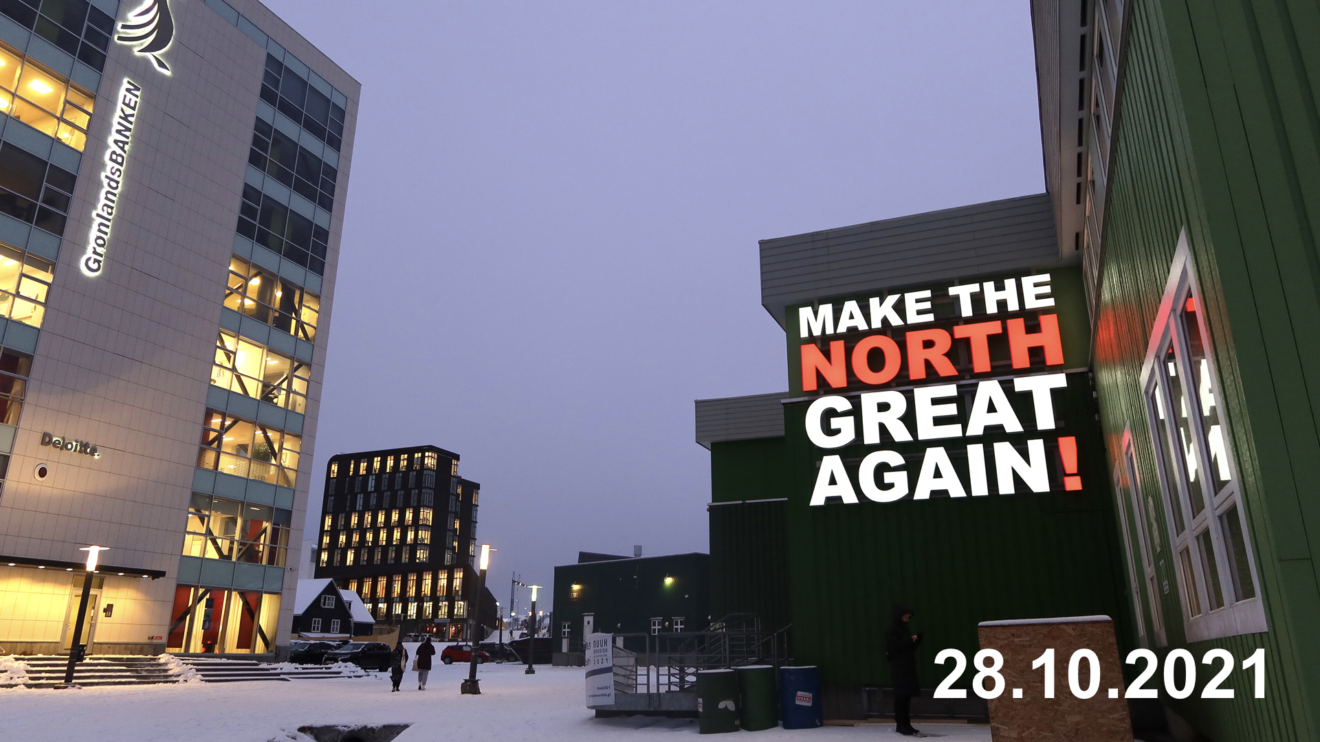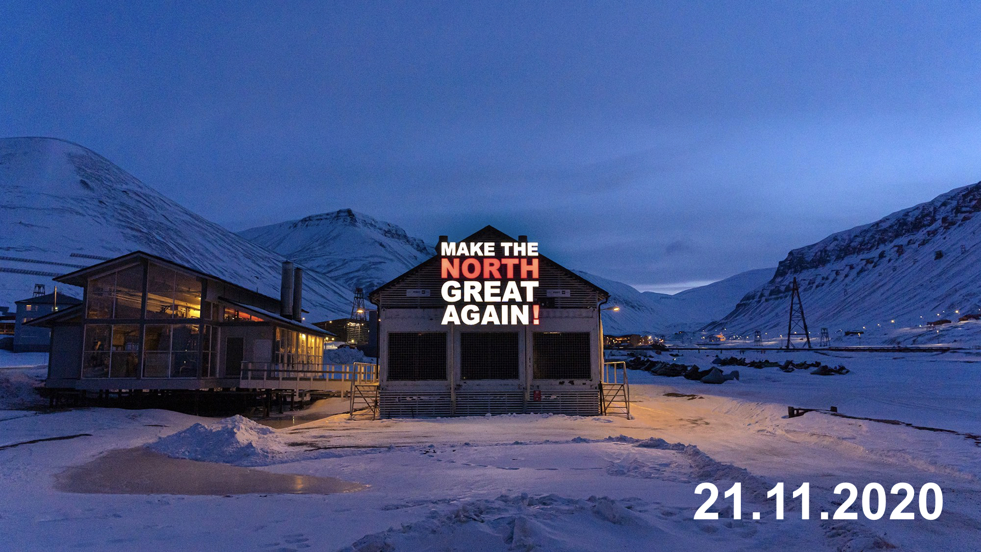 NORDTING tester også i det offentlige rom. Og virkeligheten er full av risiko fordi den ikke kan kontrolleres. █ I 2020 satte vi opp en lysinstallasjon i Longyearbyen. █ Kritikken kom allerede dagen etter. Noen mente at vi ikke forstod Svalbard, at vi burde ha vært tilstede i Longeyarbyen i noen måneder først, og hvis vi hadde gjort det, så hadde vi ikke ønsket å henge opp et så provoserende skilt. Andre mente at «Make the north great again» kan man nærmest ikke si høyt, at det er respektløst overfor ´Trumps ofre´, at vi må respektere alle som har fått det verre av politikken til den kontroversielle politikeren, at vi burde ha valgt et annet, mindre betent slagord.