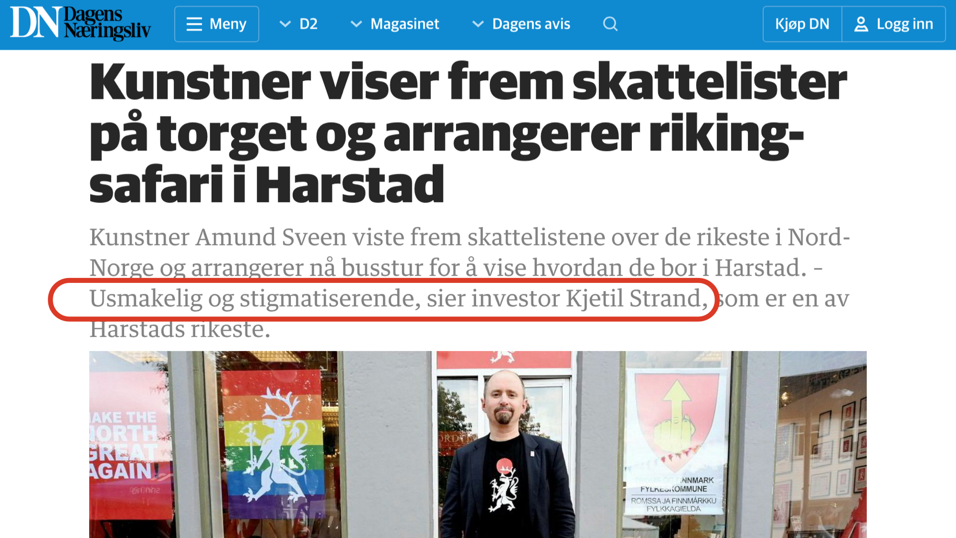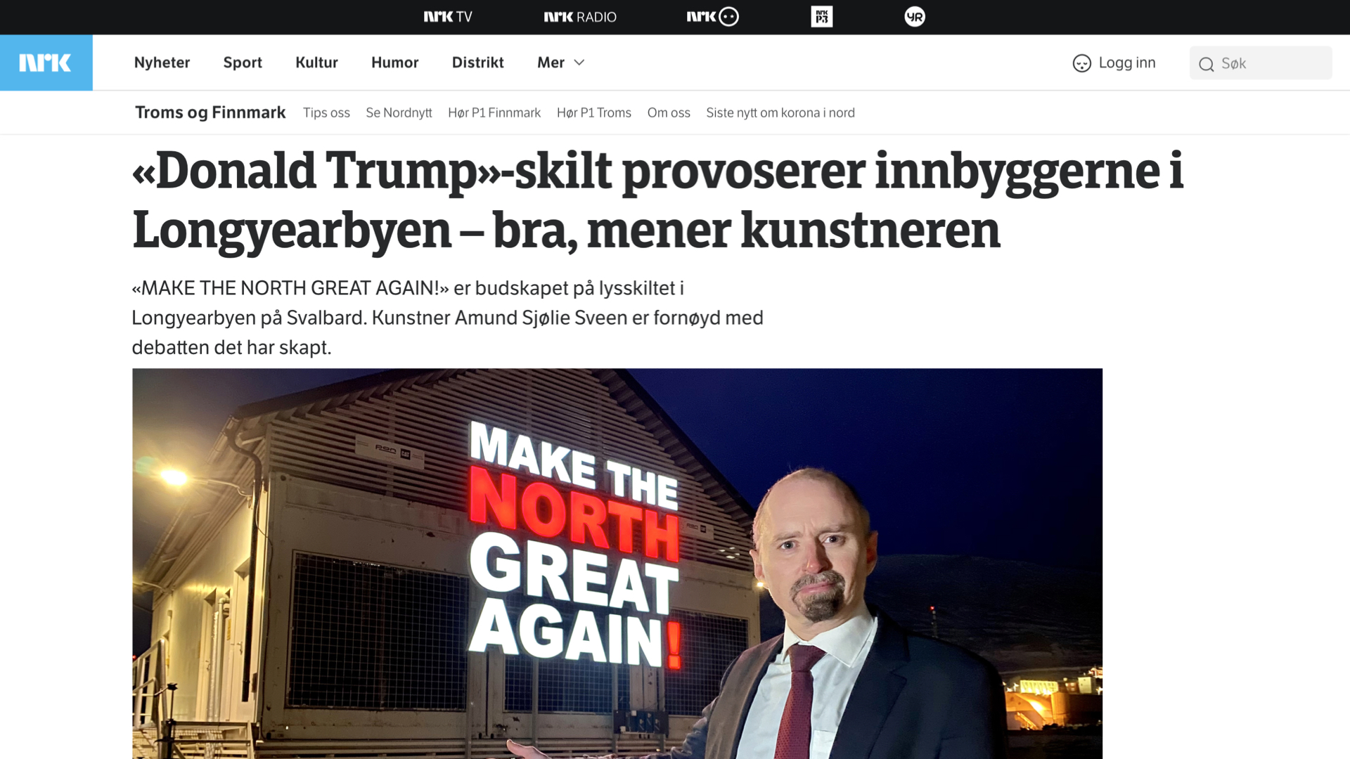 Men — og dette er viktig — da må vi også tåle å stå i diskusjonen, vi kan ikke gjemme oss og si at ´dette er bare kunst´, eller ´kunsten er fri, vi gjør som vi vil´ — for det er nettopp det som er poenget: Dette er ikke bare kunst, det er også reell politikk med reelle konsekvenser. Og vi skal være ydmyke for at ikke alle vil være med på å leke den leken vi leker: Det er selvfølgelig helt greit å hevde at et lysende reklameskilt som skriker «Make the North Great Again!» er noe dritt.