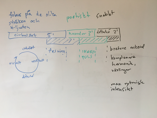 The relational dimension of the artistic palette represents inter-collaborative communication and interaction. When researching collaborative work, the relational dimension is brought to the foreground, as the structure upon which the other layers are communicated. During the work with Henrik, I have noticed how certain personality traits I carry affect how we communicate. Personality traits that have helped me to develop as a performer, with sensitivity to artistic languages of others, are for example flexibility and adaptability. To some extent being assets in collaborative work, I have also been confronted with how these personality traits may be a pitfall when it comes to mobilizing the courage of expressing one’s own creative ideas and thoughts. During the work on Cirkulära Stråk, finding a balance between the roles of suggesting and responding has been a key challenge.